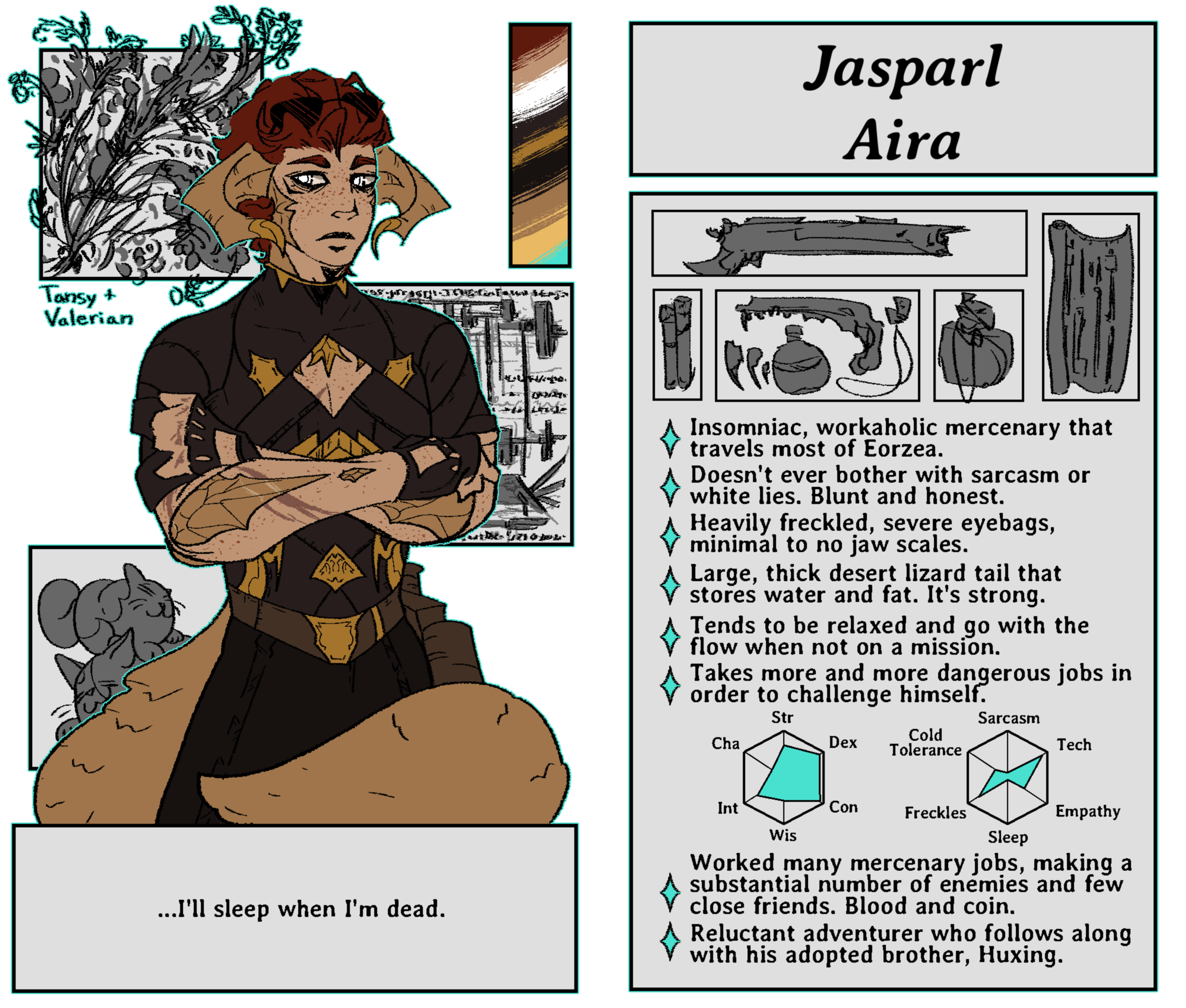 When they were young, he and his sister Jinaera (they ended up disagreeing about splitting the last name) escaped Garlean rule in their home country. They worked odd jobs all of the way to Gridania, where they both independently met Huxing. Jinaera adopted him as a new sibling and Jasparl got the shock of coworker turned family. He and Huxing do most of the adventuring, although they disagree on whether it's being an Adventurer or Mercenary.